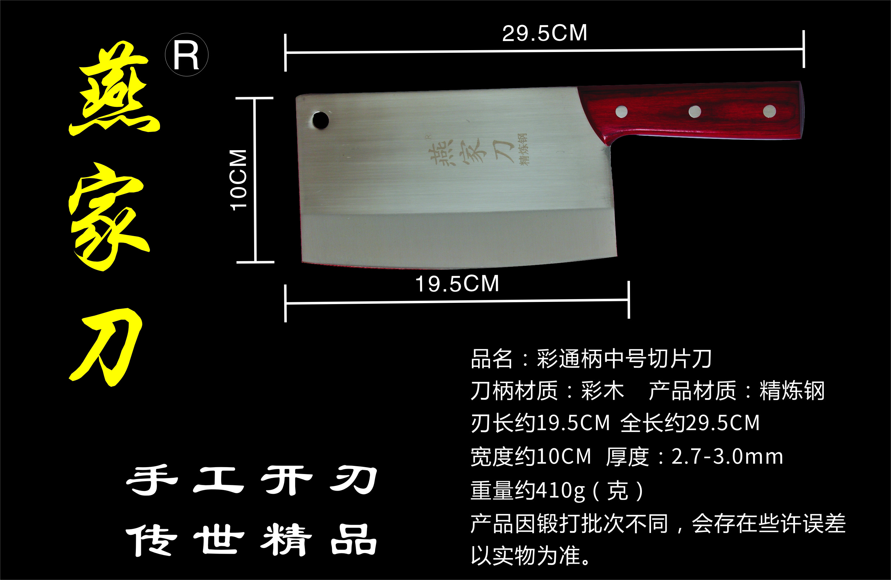 樂(lè)山燕家刀具有限公司(公司前身為燕佳鐵匠鋪),公司坐落于美麗的佛都之鄉(xiāng)樂(lè)山嘉州,在全國(guó)各地有上千家代理經(jīng)銷點(diǎn),公司專業(yè)銷售、設(shè)計(jì)、制作各類刀具。秉承一貫鍛造三精要求,即選料精、用料精、工藝精。所選材料全部產(chǎn)自滇東鐵礦優(yōu)產(chǎn)區(qū)。本品牌刀具堅(jiān)持千挑萬(wàn)選為材,千錘百煉為刀的手工鍛造工藝宗旨。具有鋒利耐磨、持久耐用,用料上乘,硬度高、韌度強(qiáng)的特點(diǎn)!
